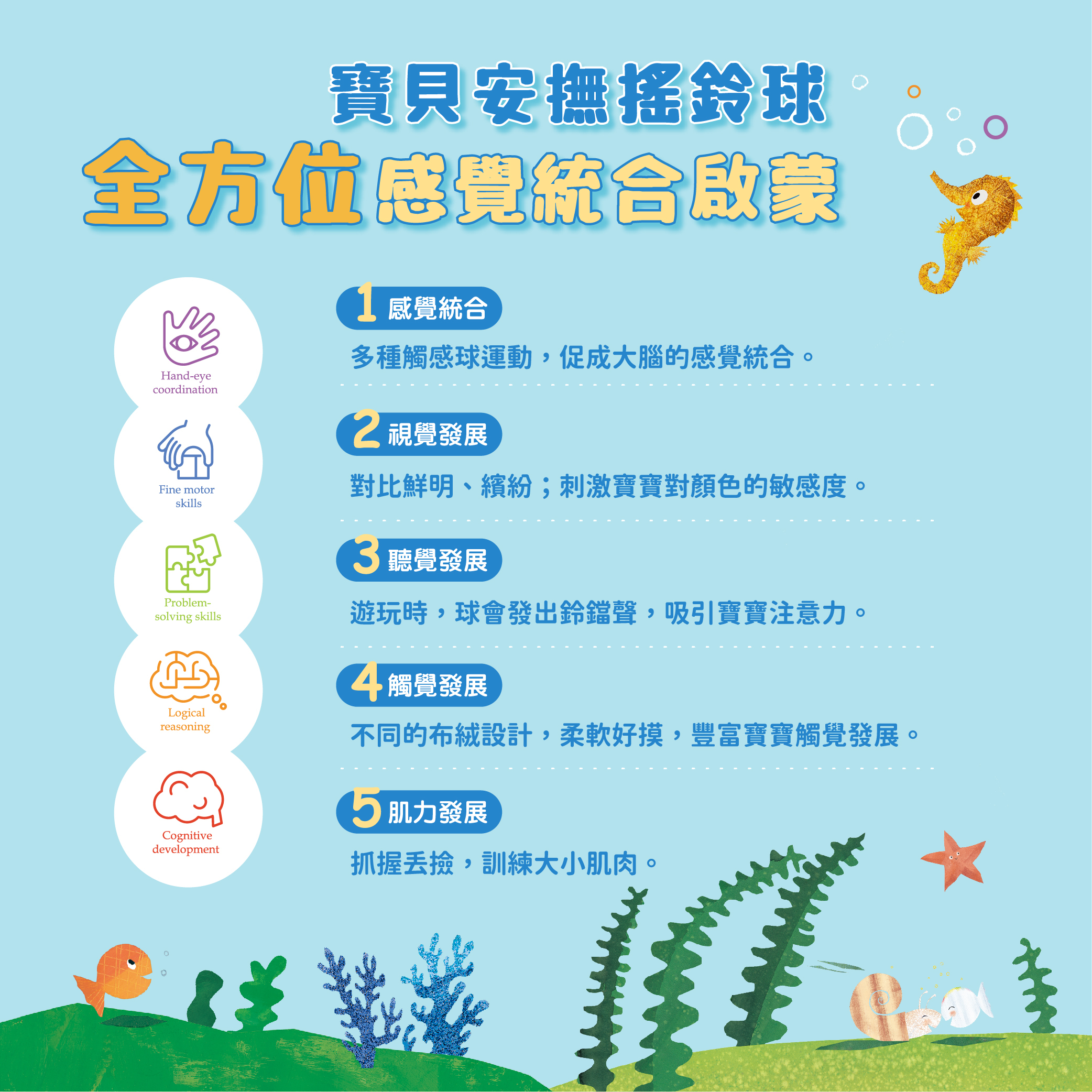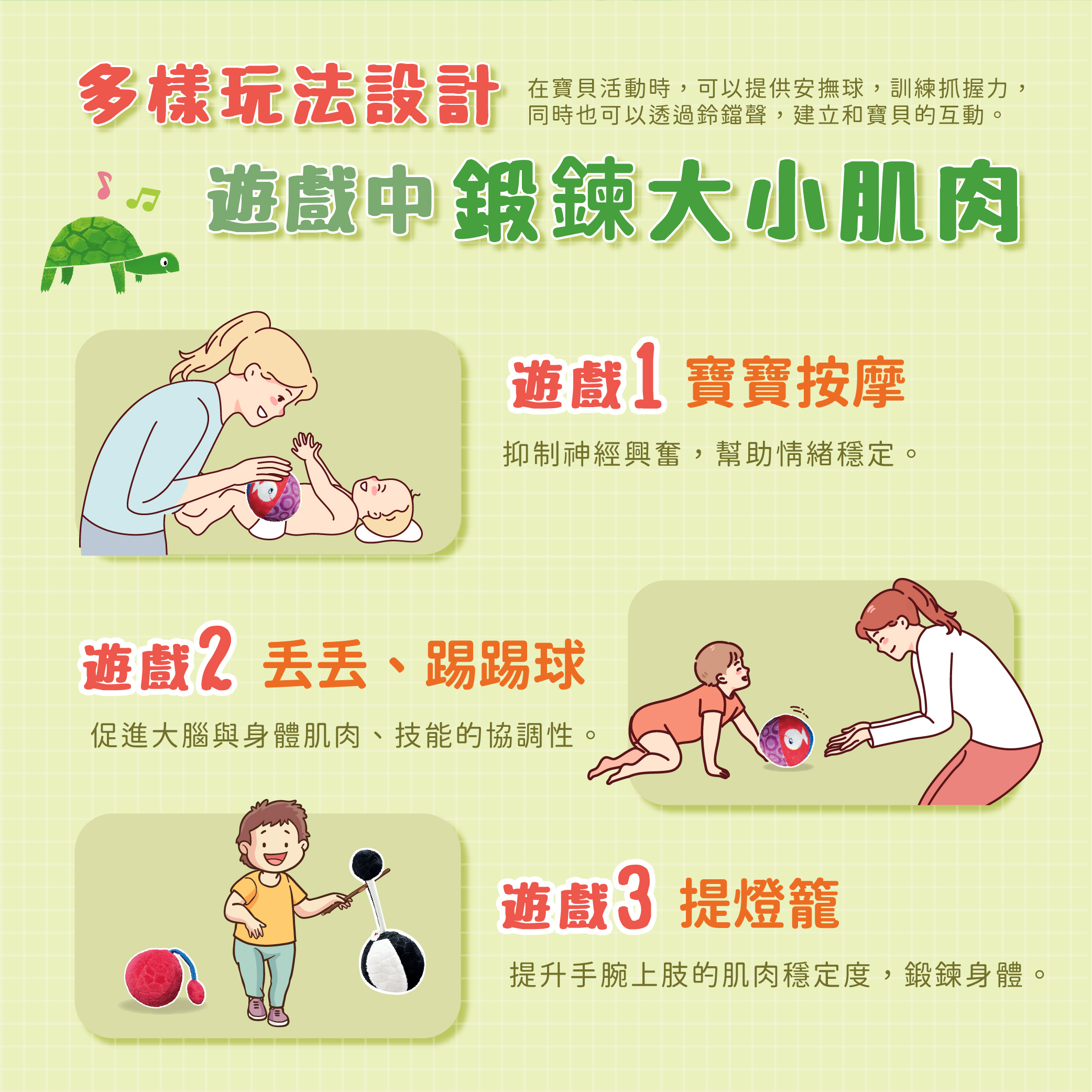 遊玩時,球會發出鈴鐺聲,吸引寶寶注意力。