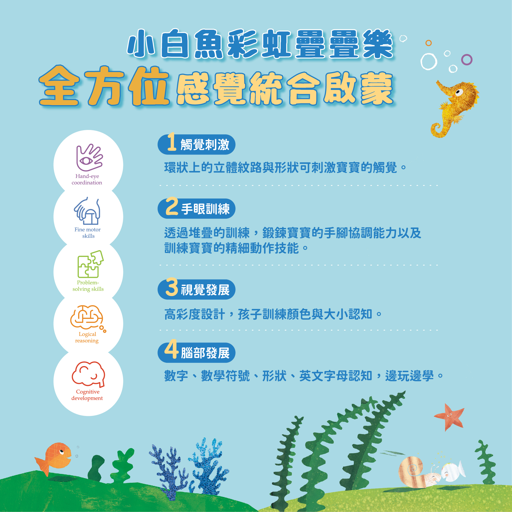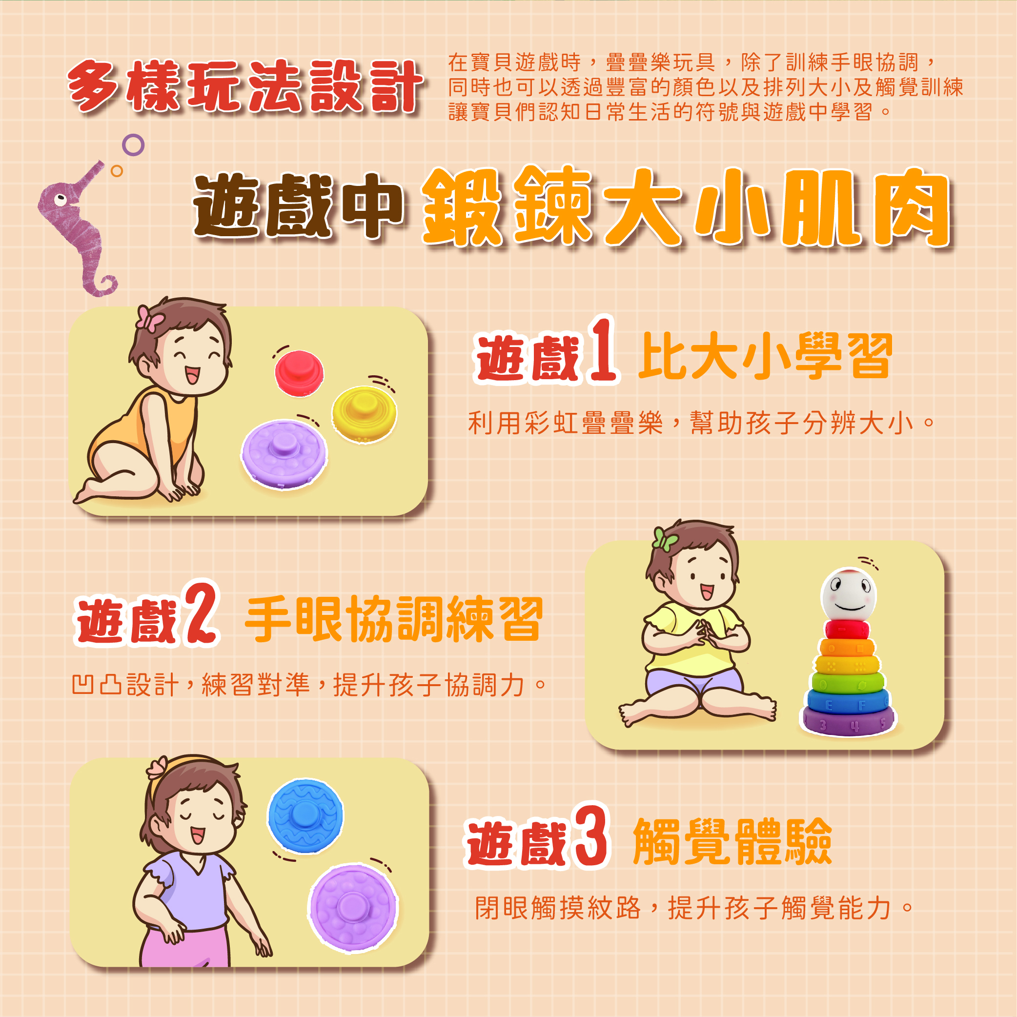 透過堆疊的訓練,鍛鍊寶寶的手腳協調能力 以及訓練寶寶的精細動作技能。
